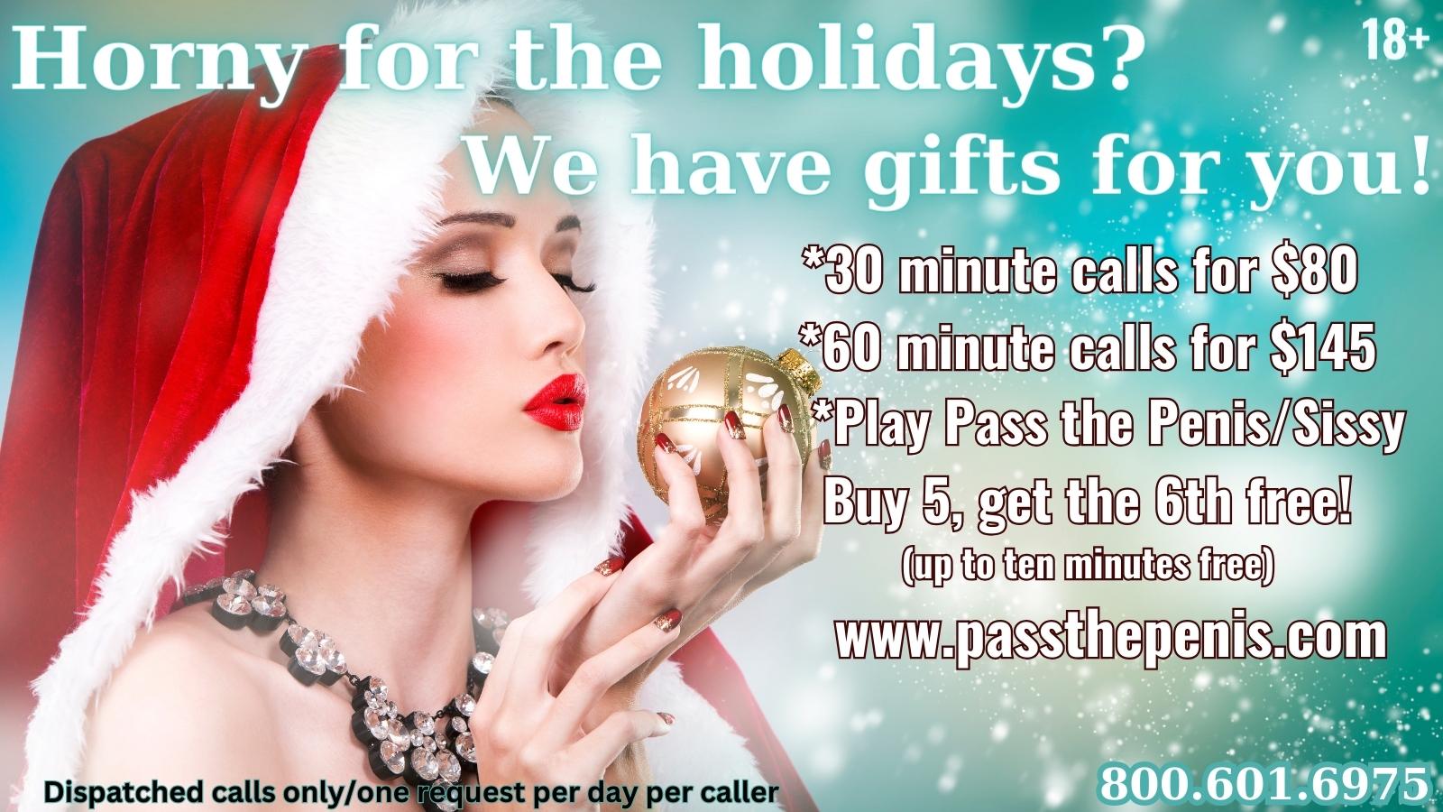 Once per day in December 2023 you can call dispatch (they’re nice, say hi when you talk to them!) and get yourself a present. You do get a choice of presents if you’re really Horny for the Holidays! You can snag yourself a discounted half hour, a discount on a full hour, or you can subject yourself to the winter holiday gauntlet and play Pass the Penis with us, for a total of 60 minutes with six different Mistresses!